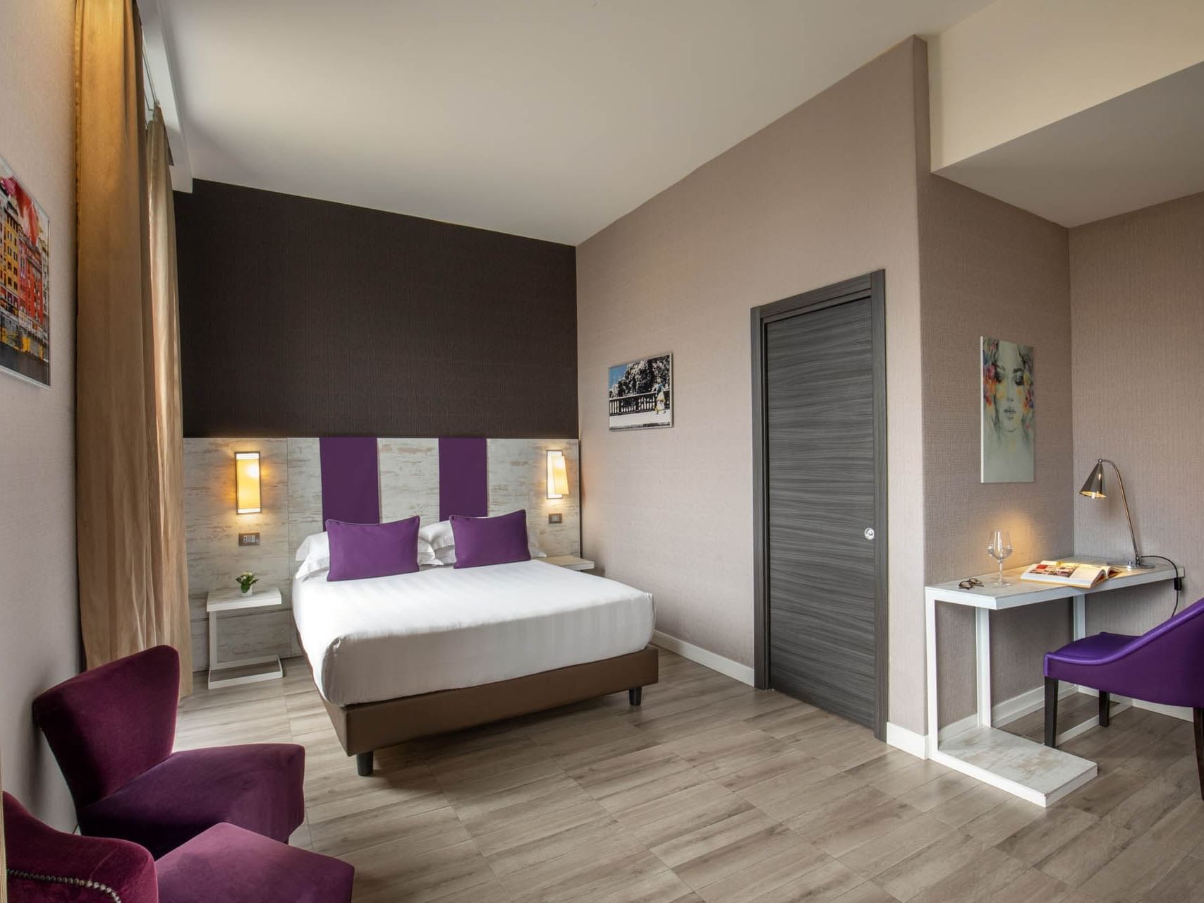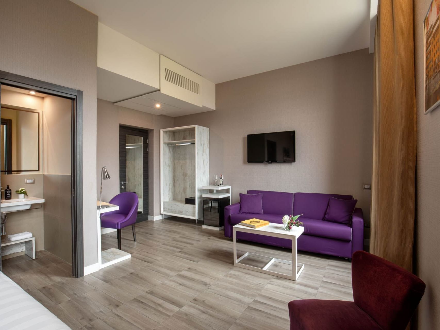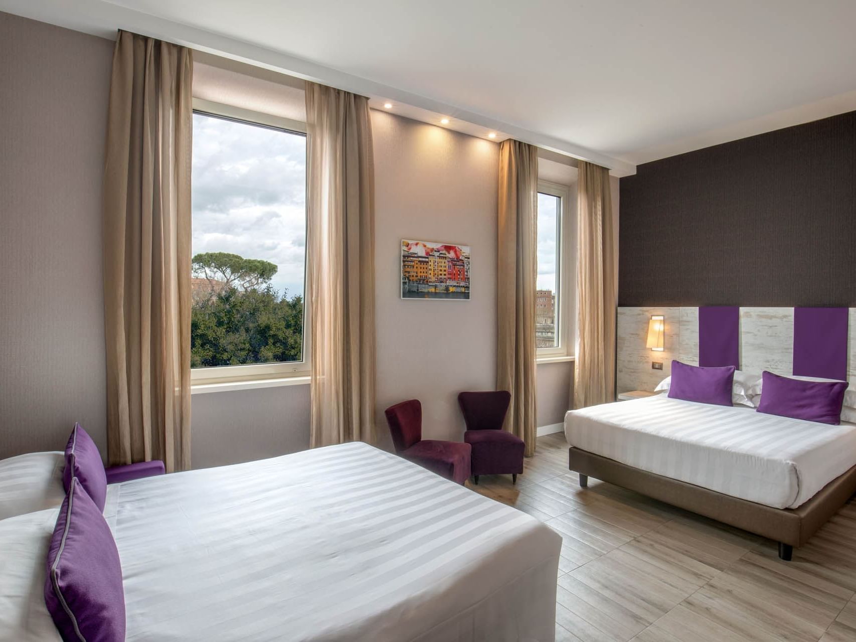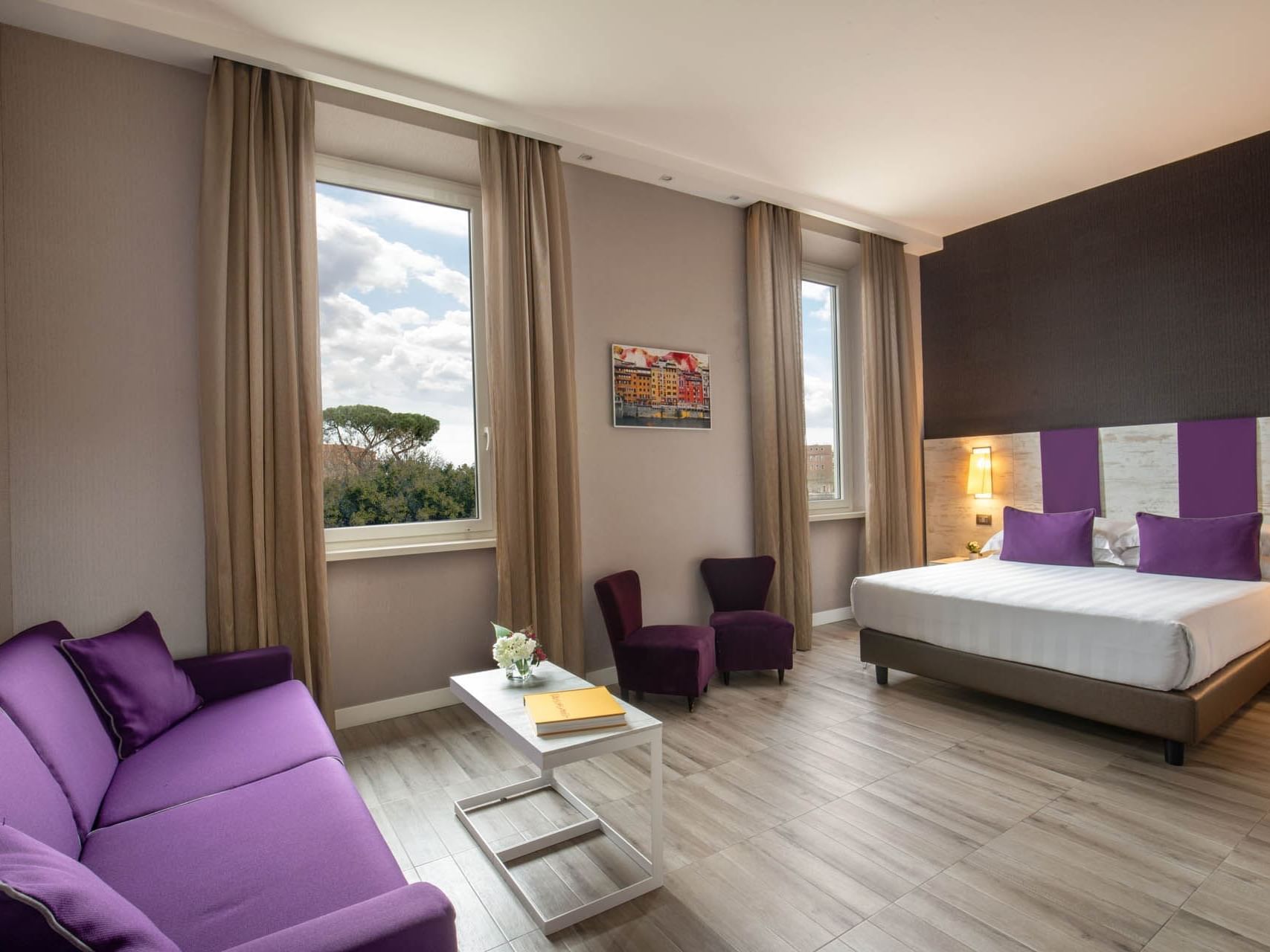 Perfetta per un viaggio in famiglia o con gli amici, la Family Room di 26 m² offre spazio e comfort per ospitare fino a 4 persone. La zona notte comprende un letto king-size e una dormeuse che può accogliere comodamente due persone (bambini). Gli arredi moderni e funzionali, uniti a servizi come Wi-Fi, TV satellitare, minibar e bollitore con tè e caffè, rendono questa camera ideale per ogni esigenza. La scelta perfetta per chi desidera vivere Roma in compagnia, senza rinunciare al relax e alla comodità.